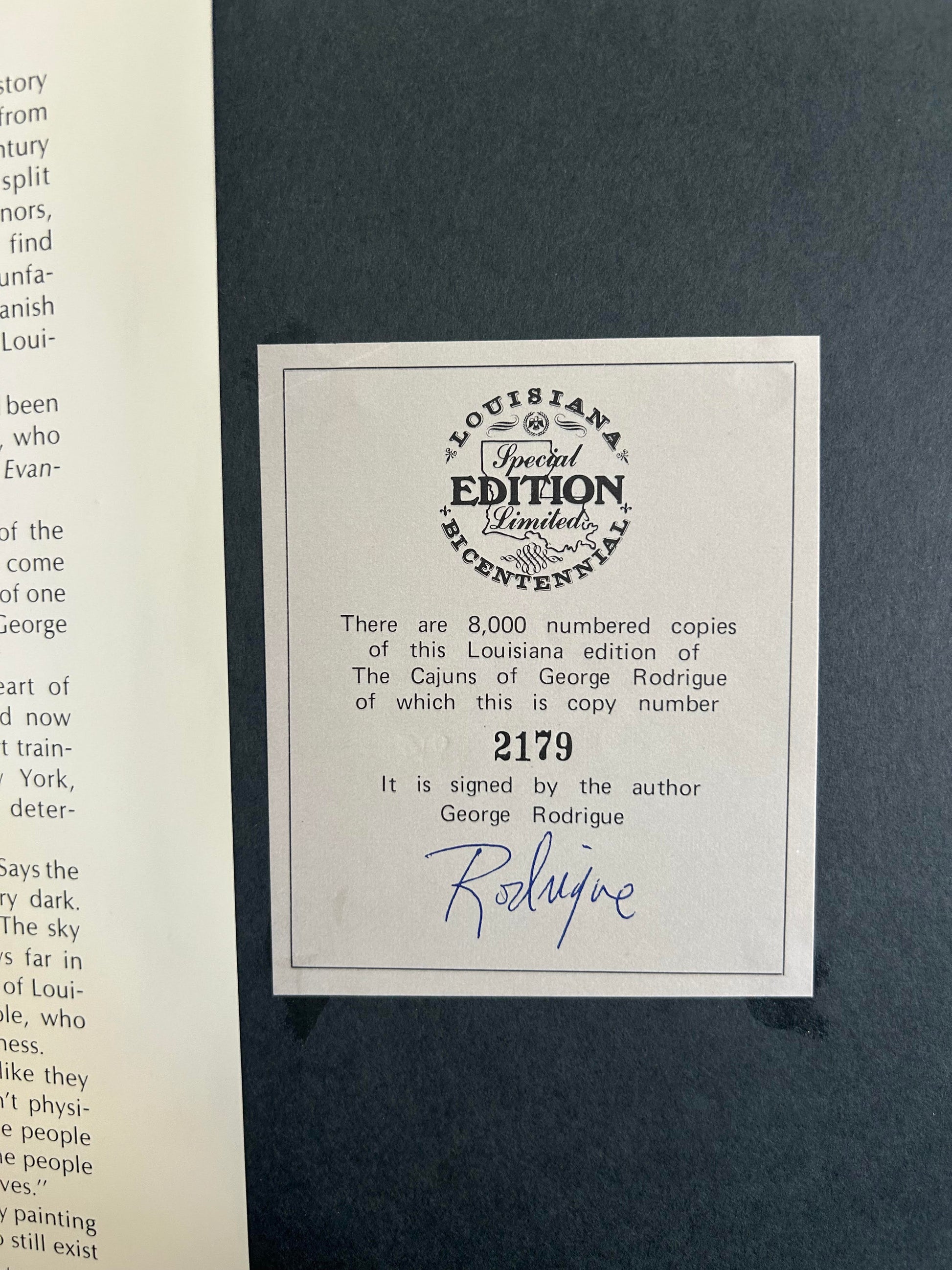 This special limited edition copy is personally signed by George Rodrigue, making it a highly collectible piece of Southern art history. The book itself is in excellent condition, with clean, crisp pages and vibrant imagery. The dust jacket shows a few minor cuts, consistent with age and handling, but the interior remains pristine.