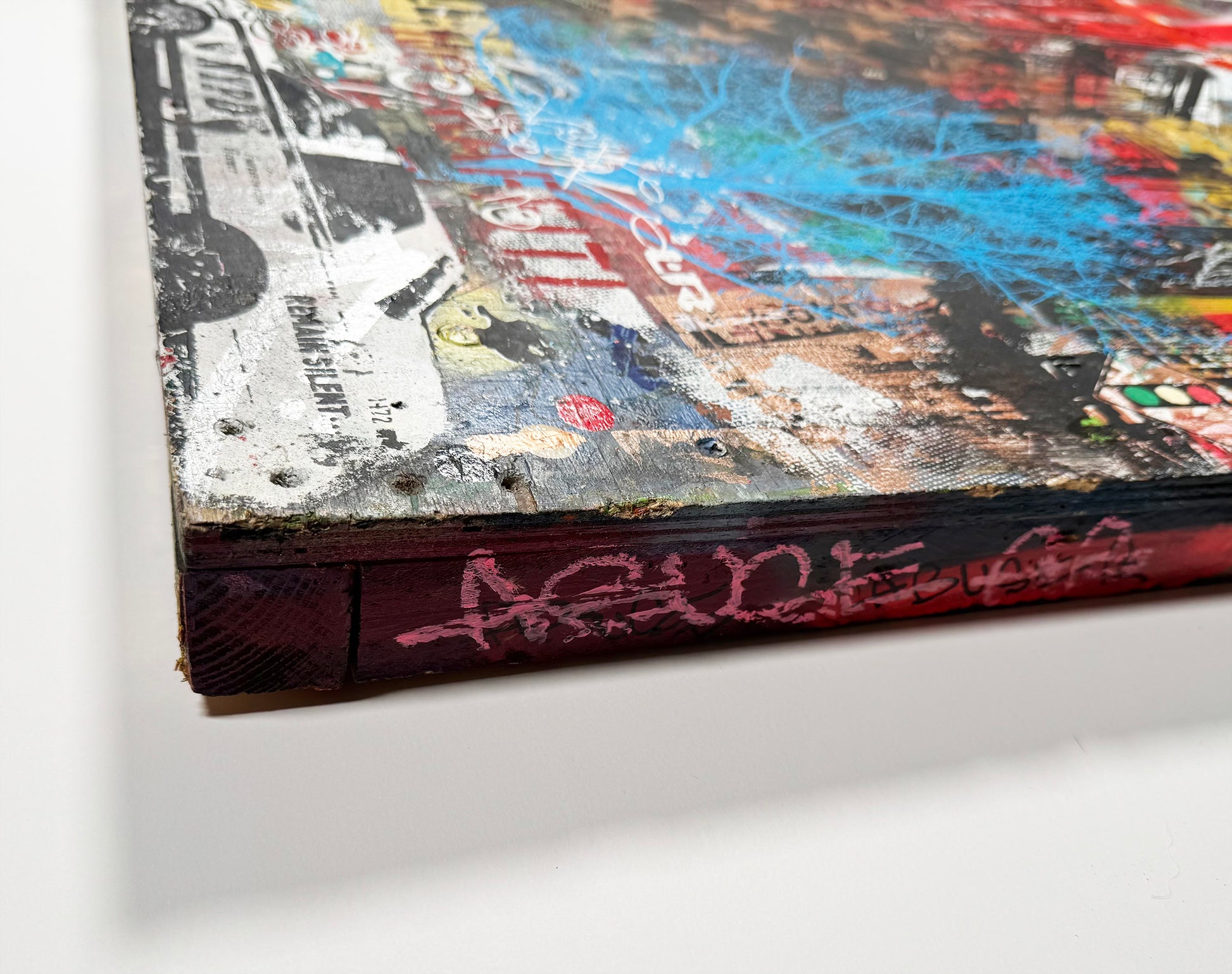 A quintessential work from the acclaimed New York street-art duo UR New York. “’Til My Last Step” layers photography, graffiti, and stencil elements into a vibrant urban collage celebrating the energy and resilience of city life. Featuring the duo’s signature blue tree motif, bold red spray accents, and vintage “REWARD” typography, the composition honors the rhythm of the streets — the stoops, the grit, and the creativity that define New York’s identity.